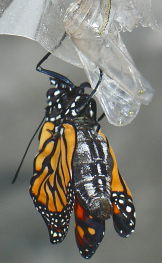 The newly hatched butterfly clings to its chrysalis for 30 minutes to an hour, during which time the fluids in its swollen abdomen are pumped into the wings. The wings straighten and grow to their full size as they fill, and the abdomen shrinks to its familiar long, thin shape. During the life of the butterfly, this fluid is circulated between wings and abdomen; it functions as a blood supply. |